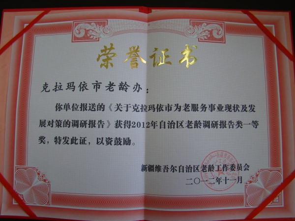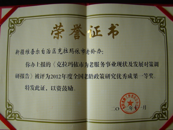 1、《克拉玛依市老龄事业发展现状与发展对策调研报告》获得全国老龄办2012年全国老龄政策研究优秀成果一等奖,获得新疆自治区老龄办2012年全国老龄政策研究优秀成果一等奖;