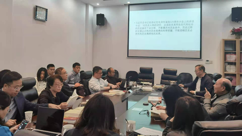 开天辟地铸伟业,周海旺副所长作为第一位领学人,作了题为《毛泽东思想的形成与发展》的报告。报告从什么是毛泽东思想、毛泽东思想是怎么形成的、毛泽东思想对马克思主义的主要贡献、如何学习和继承毛泽东思想的宝贵财富等十个方面展开,深入浅出的讲解将与会者带回争取民族独立、人民解放和探索社会主义建设道路的历史情境,对于大家在新的历史条件下,以新的视角拓展毛泽东思想研究新视野,挖掘毛泽东思想理论宝库具有很好的启迪作用。