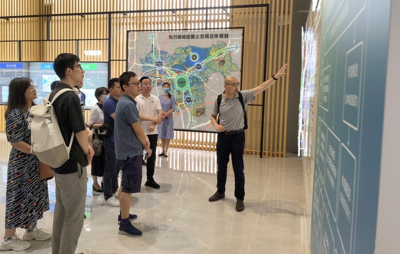 6月16日上午,党总支党员来到长三角生态绿色一体化发展示范区规划展示馆,工作人员向大家详细介绍了长三角一体化示范区、先行启动区、水乡客厅的相关规划。其中,华略智库长三角研究院院长夏骥针对示范区产业发展、制度创新、设施建设、生态环保、公共服务等内容进行了重点讲解,让各位党员对于长三角一体化示范区的建设内容、重点项目以及最新进展更加了解。参观过程中,各位党员针对示范区空间规划、产业发展、制度创新等内容不时进行交流讨论。