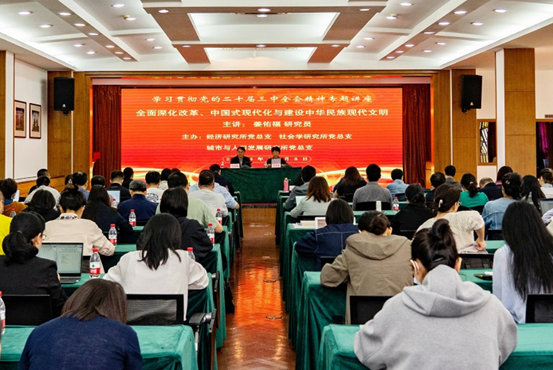 为贯彻落实院党委关于学习宣传党的二十届三中全会精神的有关部署,2024年10月8日上午,城市人口所党总支联合皇朝娱乐 经济研究所党总支、社会学研究所党总支联合举办主题党日活动。活动邀请上海市学习贯彻党的二十届三中全会精神宣讲团成员,上海社会科学杂志社社长、总编辑,哲学研究所姜佑福研究员主讲,主题为“全面深化改革、中国式现代化与建设中华民族现代文明——党的二十届三中全会精神学习辅导报告”。