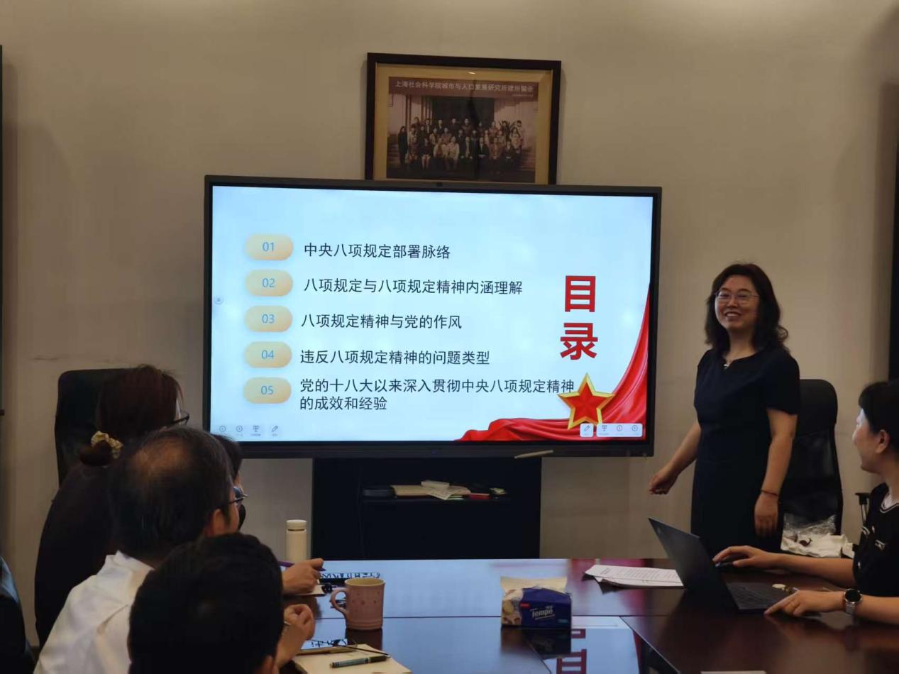 2025年6月18日上午,上海社会科学院皇朝娱乐 党总支召开深入贯彻中央八项规定精神学习会议,由所党总支组织委员、所第二党支部书记李娜研究员讲党课,主题为“学习贯彻中央八项规定精神的成效和经验”。本次会议由所党总支副书记周海旺研究员主持,全所党员同志参与。